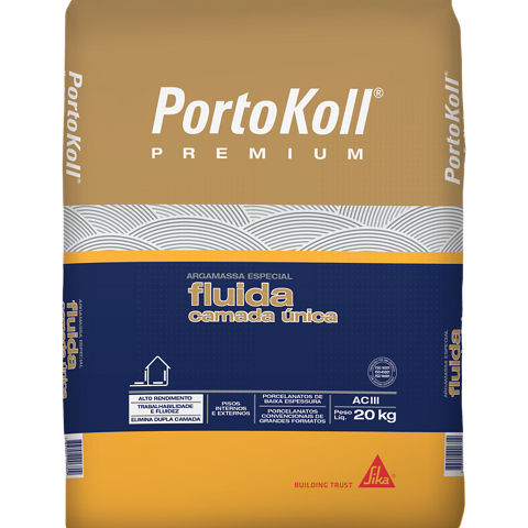 PortoKoll PREMIUM® Fluida Camada Únicaé uma argamassa especialmente desenvolvida para assentamento de porcelanatos de baixa espessura (entre 3,5 e 7 mm), e também recomendada para assentamento de porcelanatos convencionais de grandes formatos (acima de 7 mm). Este produto é industrializado e classificado como ACIII, conforme ABNT NBR 14.081-1