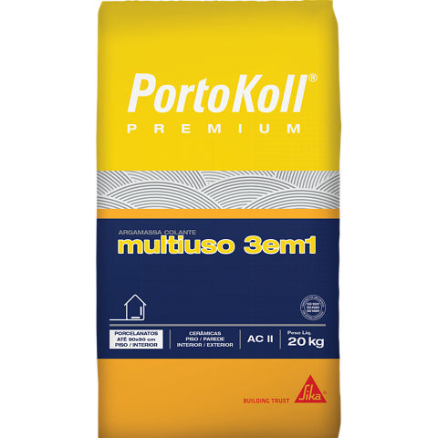 PortoKoll PREMIUM® Multiuso 3 em 1 é uma argamassa de excelente desempenho para ambientes internos e externos nos mais variados tipos de revestimentos. Este produto é industrializado e classificado como ACII, conforme ABNT NBR 14.081-1