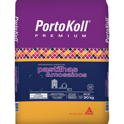 PortoKoll PREMIUM® Pastilhas e Mosaicos foi especialmente desenvolvida para mosaicos e pastilhas. Este produto é industrializado e classificado como ACIII, conforme ABNT NBR 14081-1. Atende requisitos para assentamento de revestimentos em fachadas descritos na NBR 13755.