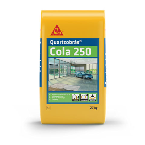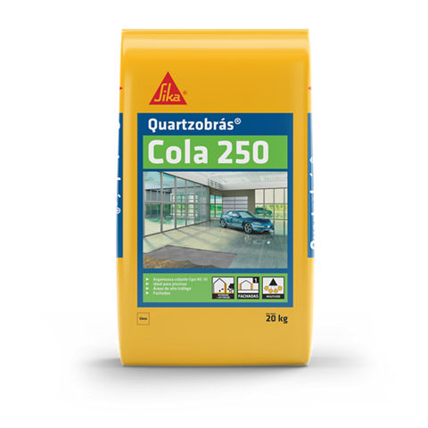 Quartzobrás Cola 250 Super Flexível é uma argamassa desenvolvida para o assentamento de mármores, granitos, pastilhas de porcelana, cerâmica, porcelanatos de grandes formatos pisos cimentícios e blocos de vidro em pisos e paredes de áreas internas e externas. Este produto é industrializado e classificado como ACIII, conforme ABNT NBR 14.081-1