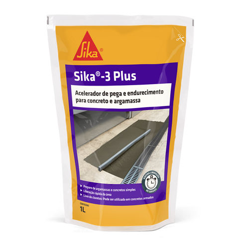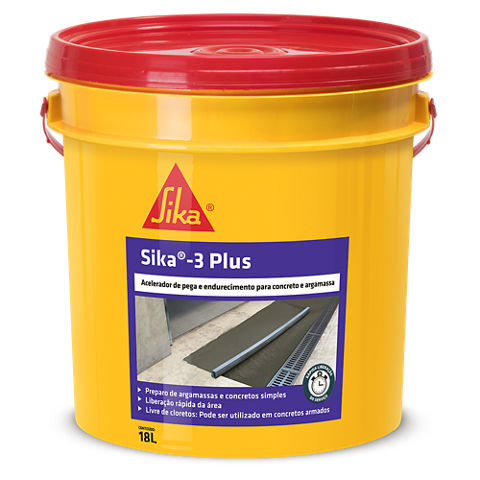Sika®-3 PLUS é um aditivo liquido acelerador de pega e endurecimento, livre de cloretos, para utilização em argamassa e concreto simples ou armados.