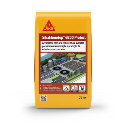 Sika MonoTop®-3300 Protect é uma argamassa à base de cimentos e aditivos especiais, polimérica, monocomponente, com fibras sintéticas, de consistência tixotrópica. Indicada para proteção de estruturas de concreto expostas ao ataque de sulfatos.