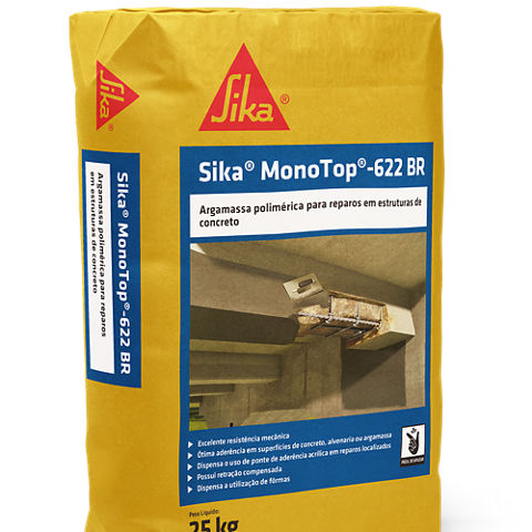 SikaMonoTop® 622 BR é uma argamassa cimentícia, polimérica, com fibras sintéticas, monocomponente de consistência tixotrópica. Indicada para reparos em estruturas de concreto em camadas de até 25 mm de espessura. É fornecido pronto para o uso, bastando adicionar água na dosagem indicada.