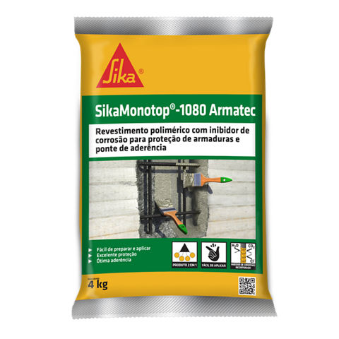 Sika MonoTop®-1080 Armatec é uma argamassa cimentícia monocomponente, polimérica, pré-dosada, material de revestimento utilizado como ponte de aderência e proteção de armaduras. Possui incorporado inibidor de corrosão e materiais reciclados que auxiliam na redução de pegada de carbono. Fornecido pronto para o uso, bastando misturar o material com água no consumo indicado.